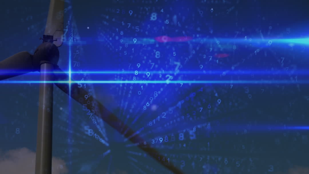 Wind turbine and dynamic digital data visualization suggest transformation of energy sector with modern technology. Potentially useful for themes on renewable energy innovations, digital infrastructure in environment-friendly practices, and global sustainability efforts. Suitable for environmental presentations, technological advancement content, or illustrating green energy data monitoring.