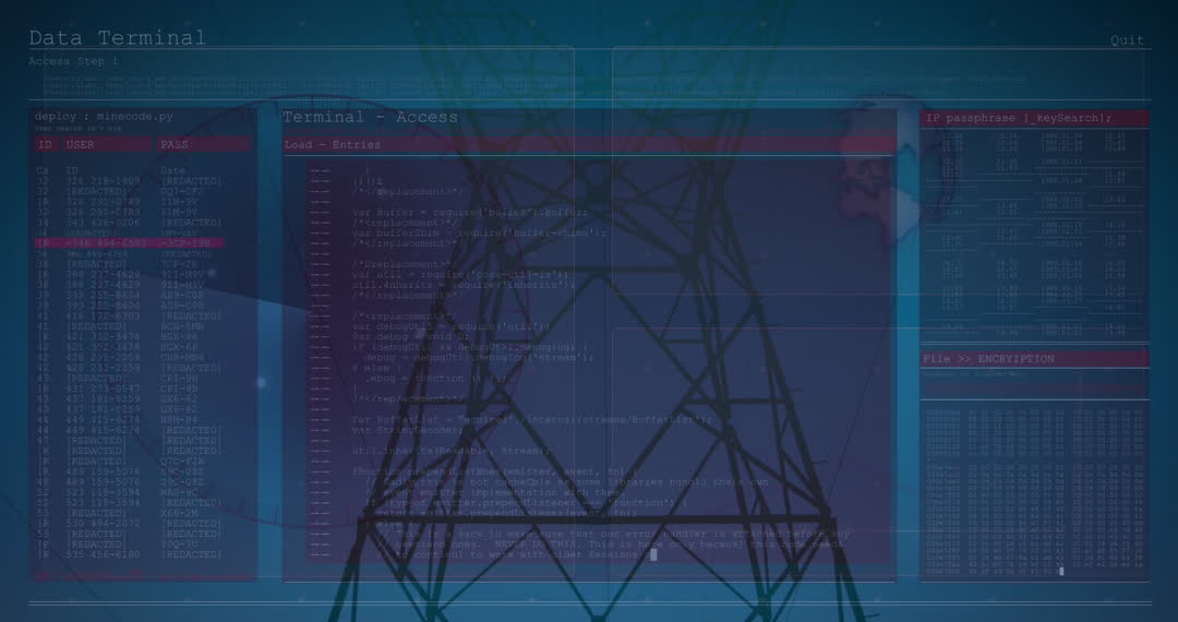 Animation reveals complex relationship between energy infrastructure and data security. Seamless blend of digital coding and electrical grid videory highlights interplay between modern technology and traditional utility systems. Ideal for illustrating topics related to cybersecurity, IT management, energy systems, and technological advancements in the power sector. Suitable for presentations, educational content, and industry analysis within energy or tech fields.