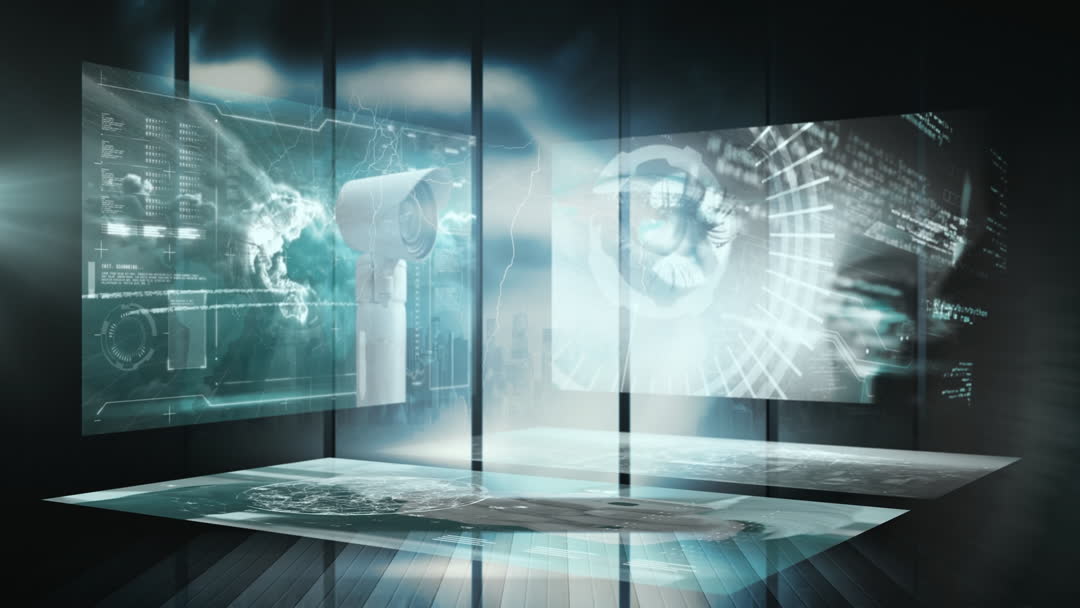This visually compelling depiction of digital data processing technology features futuristic screens with holographic projections over a black background, emphasizing the interconnected world of global technology. Ideal for use in cybersecurity presentations, technology service advertisements, digital transformation streams, or business innovation highlights.
