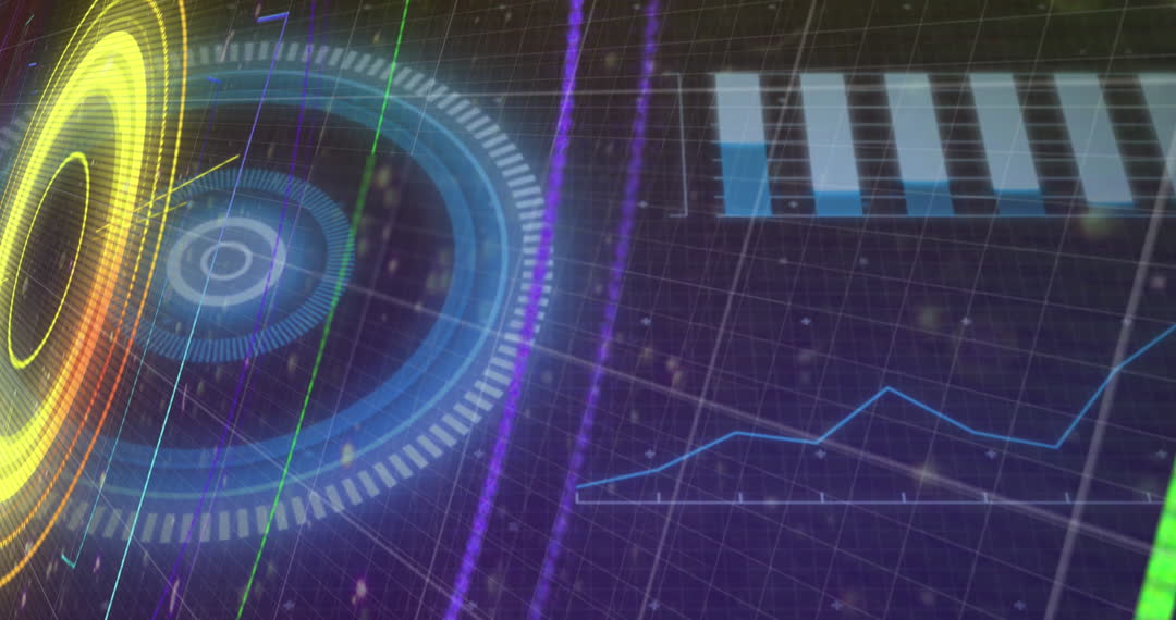 Complex digital animation featuring various elements including charts and gadget-style interface graphics, suggesting advanced data processing or futuristic computing concepts. Useful for articles or publications on technology, big data, or modern computing systems. Visual elements may also imply cyber security triumphs or failures, suitable for tech-themed backgrounds in presentations.