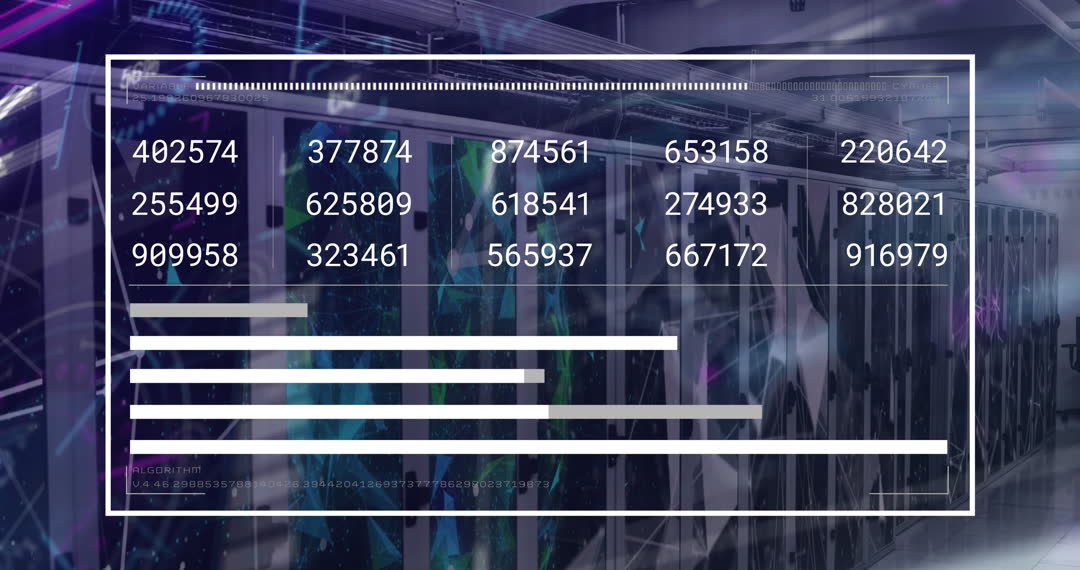 Digital animation depicts numbers overlaid on computer servers, illustrating real-time data processing and advanced computing technology. Ideal for showcasing technological advancements in computing, big data analysis, and server infrastructure. Useful for presentations on IT solutions, resources for tech news articles, or promotional material related to data analytics services.