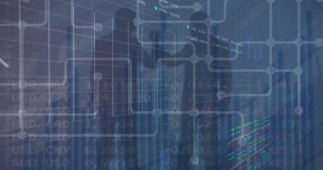 Digital theme with overlapping grid and data connects over silhouettes of business professionals, representing modern business analytics and financial technologies. Suitable for content relating to financial tech, global markets, business analysis, entrepreneurship, or data visualization materials.