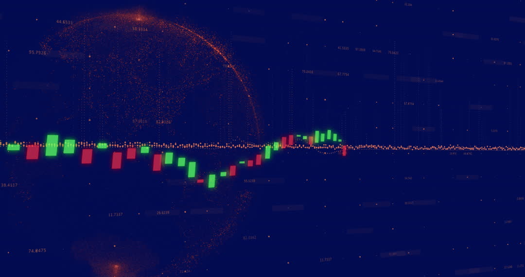 Image shows dynamic neon-colored financial data with a globe in the background. Useful for financial analysis website, technology blog, digital marketing materials illustrating global commerce data processing or financial trends.