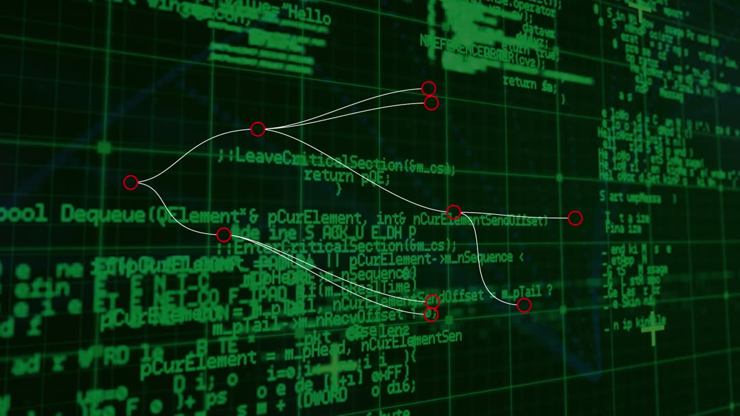 Green digital interface with animation of network connections over coding scripts. Ideal for portraying modern technological themes such as encryption, cybersecurity, software development, and global data transfer concepts. Useful in background settings for presentations, technology blogs, and cyber-centric websites.