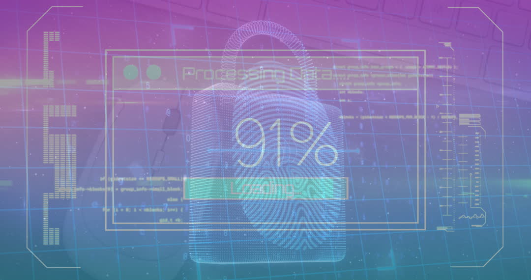Illustrates a concept of digital security with an animated padlock overlay during data processing. Useful for presentations or articles on technology, cybersecurity and secure data handling.