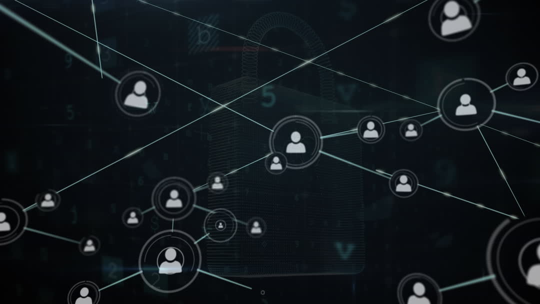 Digital illustration showing a network of user icons connected by lines over the shadow of a padlock, representing data security concepts. Suitable for use in tech blogs, cybersecurity advertisements, information brochures, and educational materials about digital data protection.
