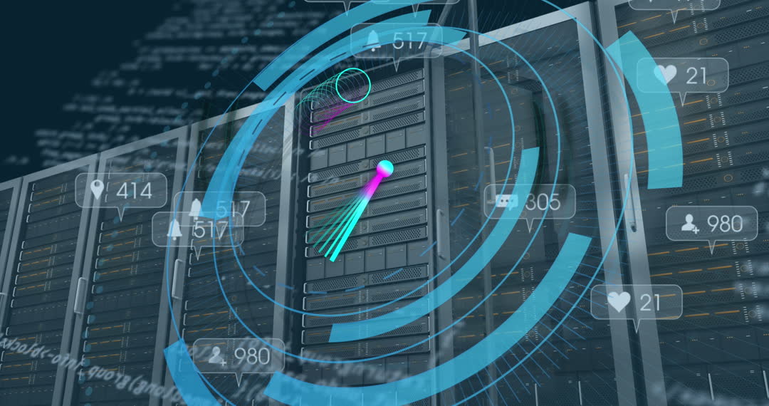 Imagery of animated scope scanning data servers surrounded by various social media icons represents the integration of digital networking and data analysis in modern technology. Ideal for presentations on data science, cybersecurity, and social media trends or uses in tech-driven marketing materials and educational resources.