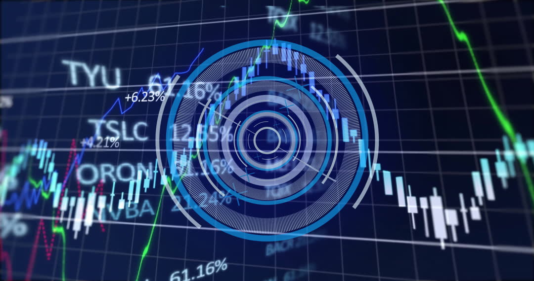 A dynamic animation showcasing scope scanning and data processing with global connections. This animation features futuristic interface elements and financial charts, conveying themes of digital interaction and information analysis. Suitable for illustrating concepts in technology presentations, financial market analysis, and educational videos in data science.