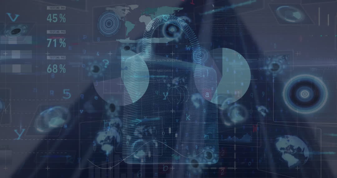 Visual represents digital security concept with various technological elements highlighted. It showcases the animation of data processing over an illustrative padlock, symbolizing protection, safety, and reliability. Suitable for use in articles, presentations, or websites focused on conveying messages about cyber safety, data protection policies, technology advancements, and modern global business interfaces. Helpful for modern technological educational material or content aiming to illustrate the abstract nature of digital security and its importance in business contexts.