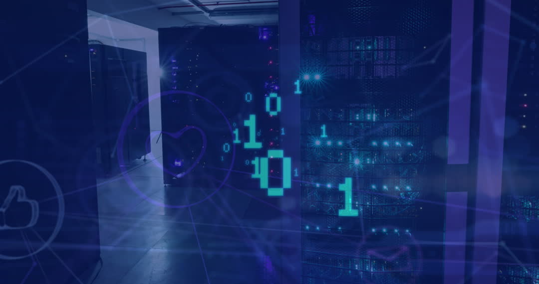 Image depicts digital data and network connections symbolized by binary codes overlaying modern server room. Vibrant displays of technology represent data flow and digital connectivity. Useful for illustrating concepts in information technology, digital transformation, computing power, and data centers.
