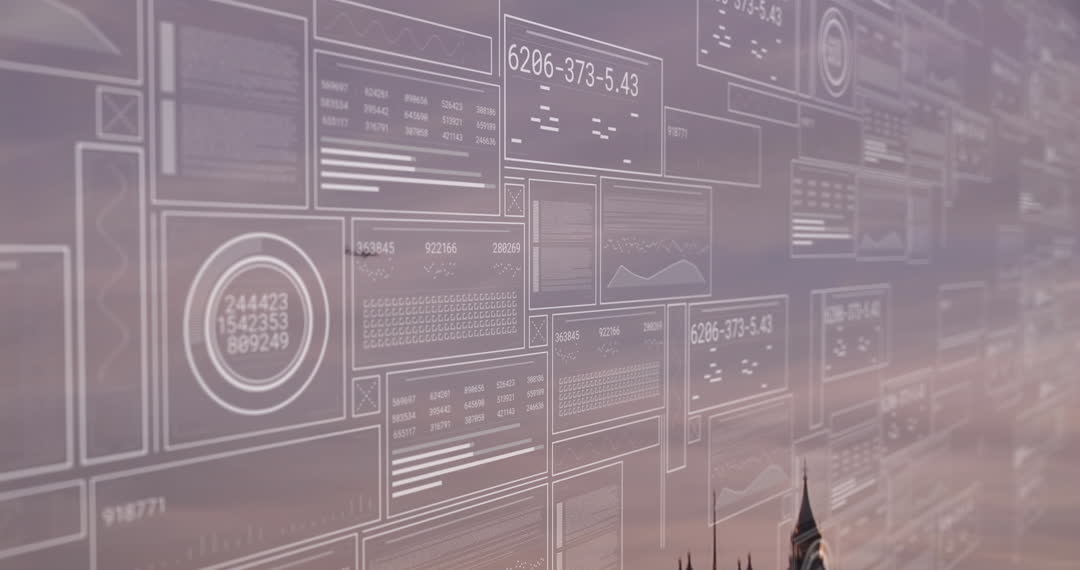Digital interface displaying faculty conceptualization of data processing above city skyline symbolizes blending of technology and urban development. Ideal for use in presentations about smart cities, tech innovation, or global business growth.