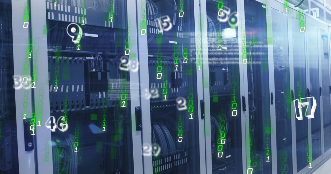 Binary code and digits appear over a row of server racks, representing data processing and network infrastructure. Ideal for illustrating concepts related to technology, cloud computing, and the digital exchange of information. Suitable for use in educational materials or tech-related content.