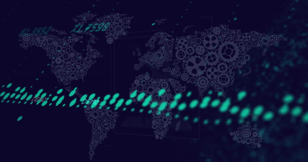 Abstract illustration showing flowing digital data streams over a faint world map made of interconnected gears, symbolizing global digital connectivity and technology-driven processes. Suitable for depicting concepts of international networks, cloud computing, or industrial digitalization in presentations and blogs.