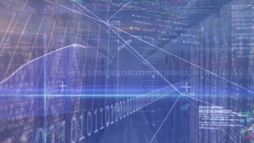 This illustrates digital streams of financial data and binary code flowing through server rooms, highlighting modern finance, data processing, and technology. It is perfect for representing concepts of global business networks, technology-driven finance, or illustrating futures in today's global data-driven economy, suitable for corporate presentations, financial technology websites, or educational materials on data analytics.