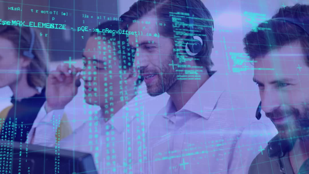 Technologically enhanced view of business professionals wearing headsets, indicating a call center atmosphere with digital data overlay. Ideal for showcasing customer support services, digital transformation, and technological advancement in business.