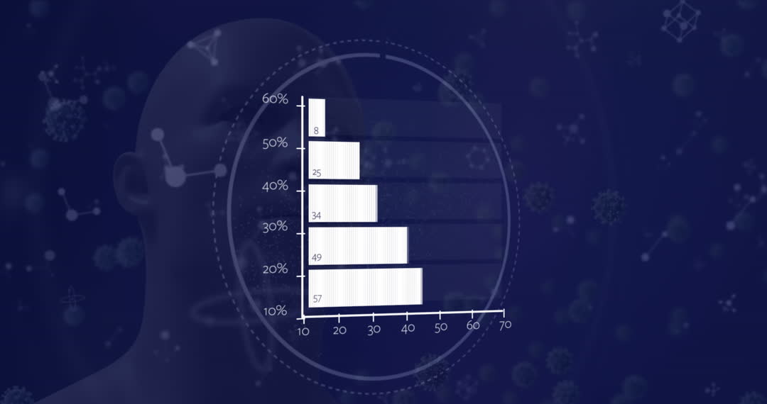 Conceptual representation of data processing and analytics with human silhouette, implying human focus on data. Ideal for illustrating themes of digital transformation, statistical analysis in science and technology. Useful for blogs or articles on business intelligence, finance, and modernization.