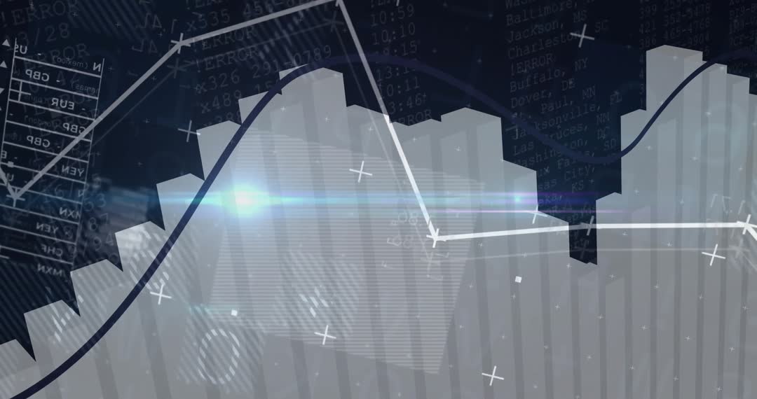 Dynamic digital dashboard featuring translucent bar charts with overlaid white and navy blue lines. Ideal for illustrating financial data analysis, technological trends, or business investments. Suitable for use in presentations, reports, and educational materials related to data analytics and technology integration.