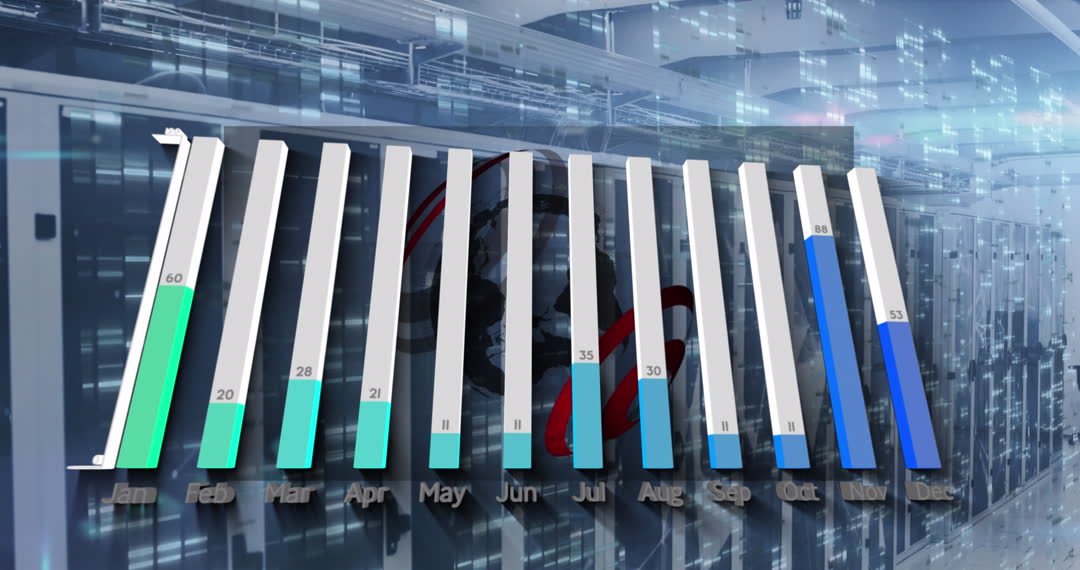 Animation depicts monthly graphical data overlays on a server room, conveying themes of technology and analytics in modern data processing environments. Useful in illustrating concepts of big data analysis, cloud storage solutions, and advanced technology infrastructure. Ideal for technology-related presentations, digital adverts, and educational resources about data networks.