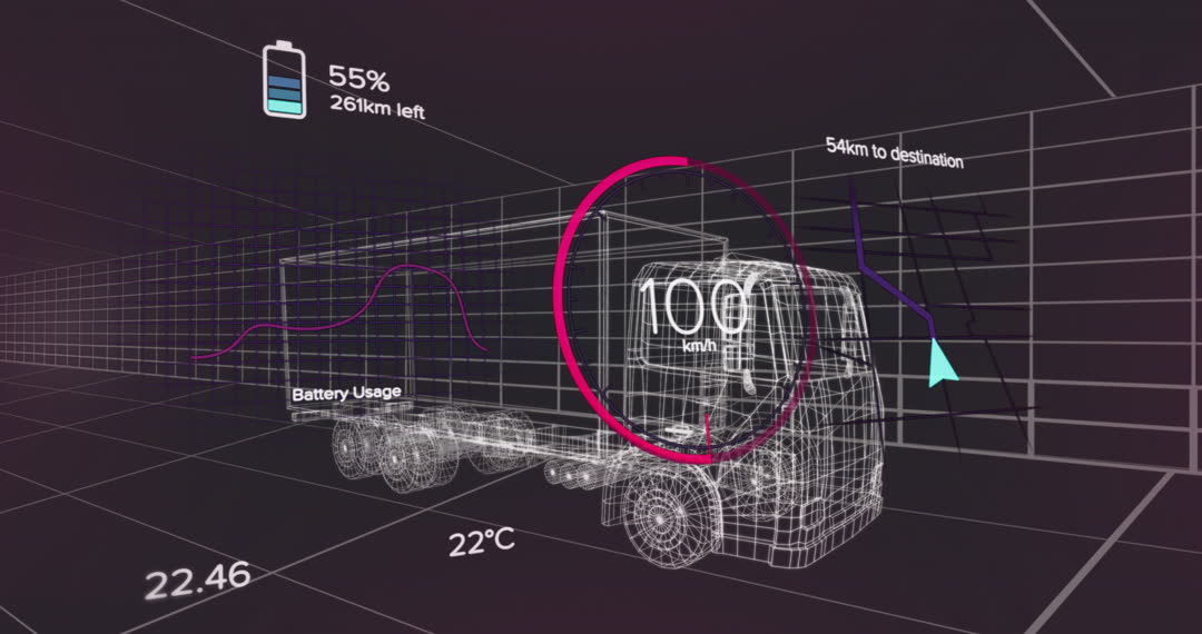Digital representation of a truck with layered data information displayed, including metrics such as speed, battery life, and distance to destination. Ideal for use in technology ads, transport innovations, automotive infographics, or presentations focused on smart vehicles and data analytics.