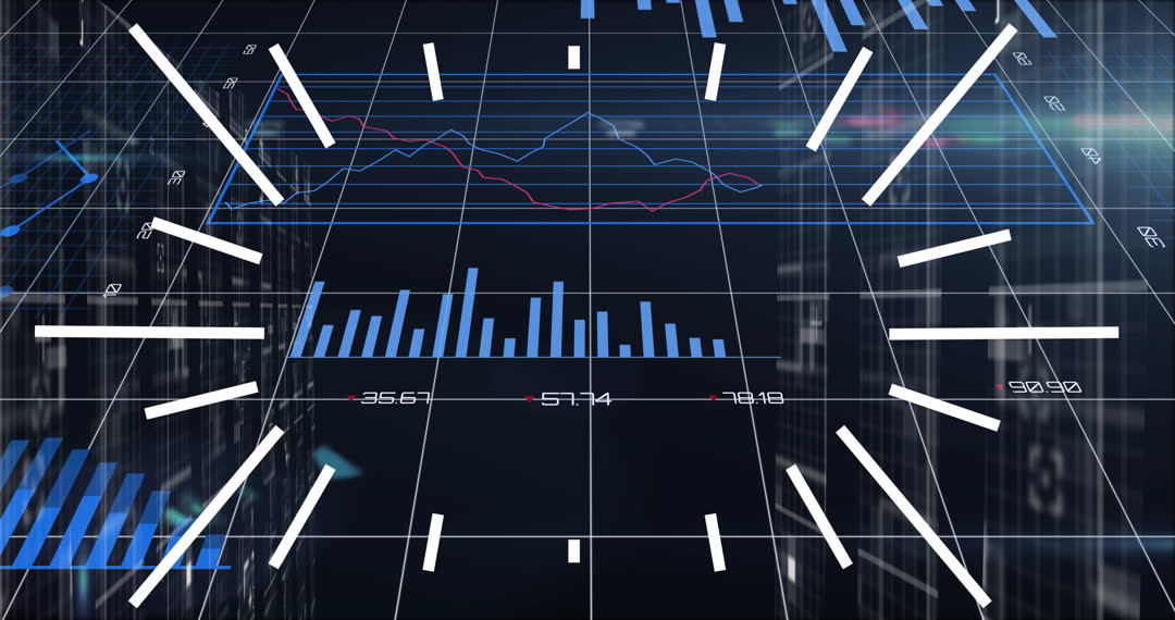 Encompasses an abstract blend of data charts, bar graphs, and clock-like graphics in a digital interface. Useful for projects involving technology presentations, data analysis themes, corporate slideshow backgrounds, or educational content explaining data science concepts.