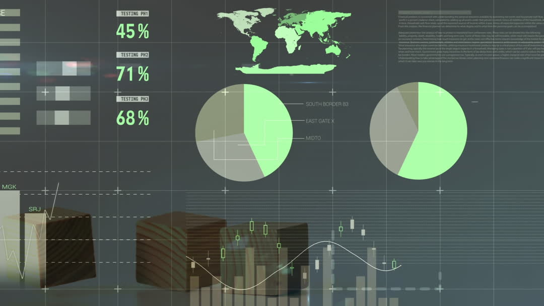 A digital display showcasing animated graphs and charts representing complex data. Highlights include percentual data, 3D blocks, and world maps suggesting global information processing. Ideal for presentations on data analytics, technological advancements, or as visual effects in videos demonstrating digital interfaces and computing systems.