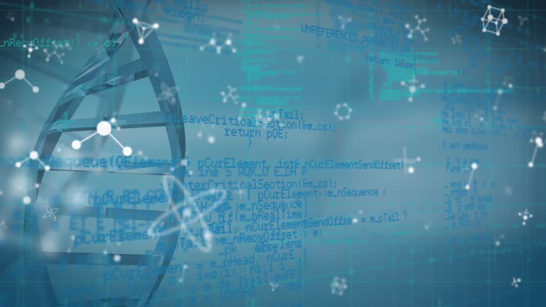 A digitally rendered video showcasing a DNA strand intertwined with molecular structures against a backdrop of data code, suitable for illustrating scientific articles, biotechnology advancements, or genetics research. Ideal for presentations and publications in the fields of digital innovation, data science, and healthcare technology.