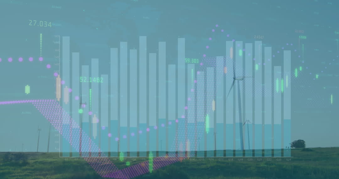 Overlay depicts a dynamic presentation of data analytics pulsating above a backdrop of wind turbines, symbolizing the convergence of technology and renewable energy sectors. Ideal for use in materials highlighting environmental sustainability, technological advancements in clean energy or presentations on green innovations and future technologies.