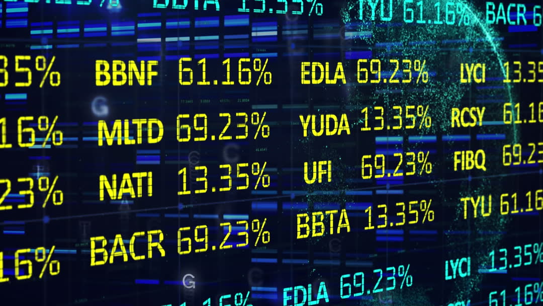 A vibrant animation depicts various stock symbols alongside percentages, representing data crucial for investors and financial analysts. This conveys the dynamic nature of global markets. Perfect for presentations, educational content on stock trading, or visual aids in discussions on market trends.