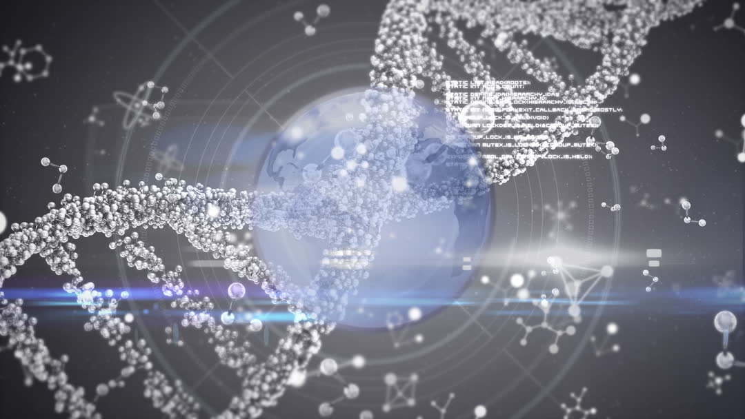 Futuristic digital illustration combining DNA strands and data processing videory with a globe, symbolizing advancements in biotechnology and global scientific exploration. Suitable for use in educational materials, scientific presentations, or technology-related content to emphasize innovation in genetics and data technology.