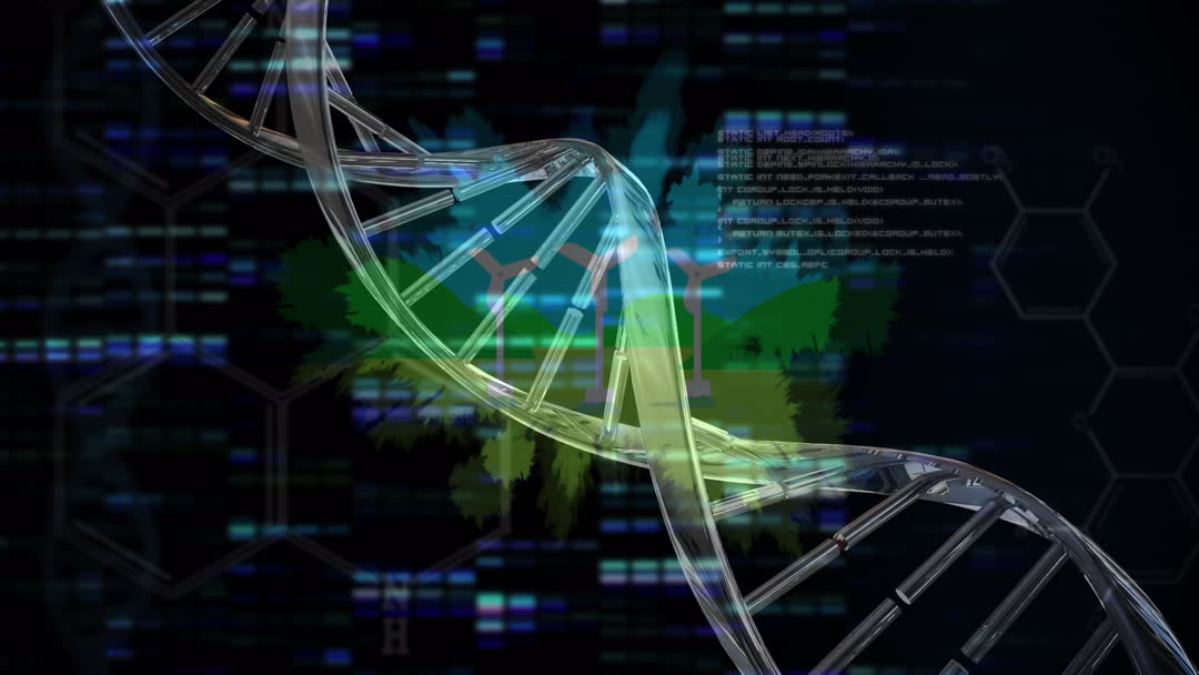 Animation shows intertwining themes of DNA and wind turbine technology, illustrating a connection between biotechnology and renewable energy. Useful for content focusing on sustainable innovation, environmental technology advancements, and the intersection of biology and clean energy sectors.