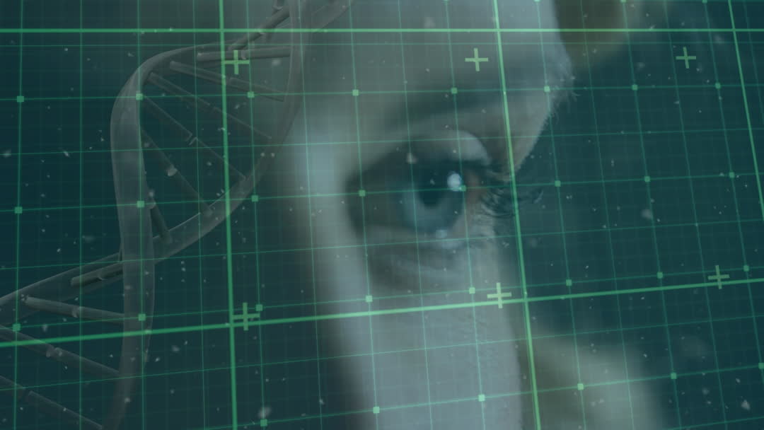 - Digital DNA Helix Overlay on Female Eyes: Exploring Biotech and Genetics