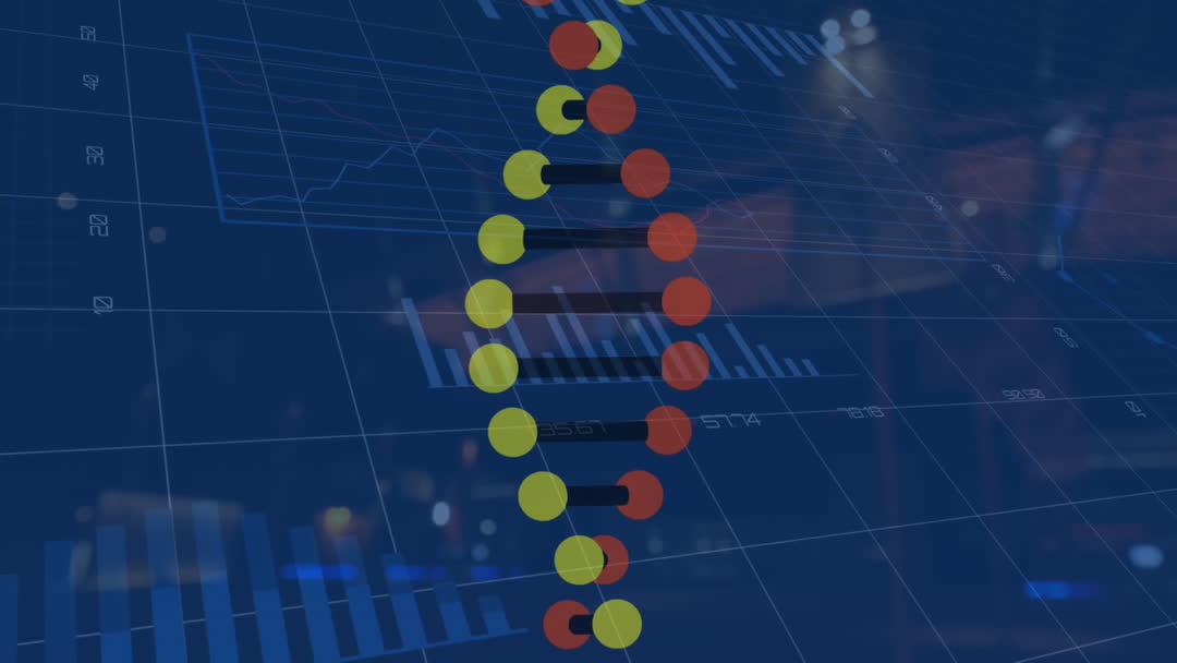 Digital animation depicting a DNA strand intertwined with complex data visuals and network connections. The video evokes a sense of futuristic biotechnology and global interconnectedness. Suitable for use in the contexts of genetics, data science, global networking, technological advancements, and educational materials in scientific fields.