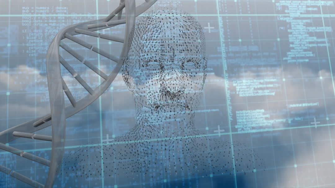 Digital illustration features DNA strand with data processing background, symbolizing intersection of genetics and technology. Human head made from data points adds focus on biotechnology advancements and artificial intelligence's role in science. Ideal for use in articles, presentations, or campaigns focused on genetic research, data analysis, or the future of technology in healthcare.