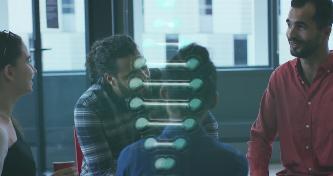 Group of diverse professionals in casual office setting with digital DNA strand overlay symbolizing the integration of biotechnology and business innovation. Useful for illustrating technology-driven discussions, teamwork, and the fusion of science and industry in corporate settings.