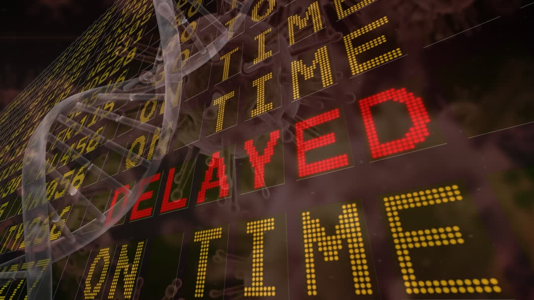 Conceptual representation of a global pandemic showcased through a digital interface. Display portrays a timetable with delayed status illuminating, overlaid with swirling DNA strands and translucent virus cells. This suggests themes involving scientific research on genetic sequences and the broader implications of medical emergencies. Great for use in articles or presentations about public health insights, advancements in genetic research while examining the impacts of a prolonged crisis.