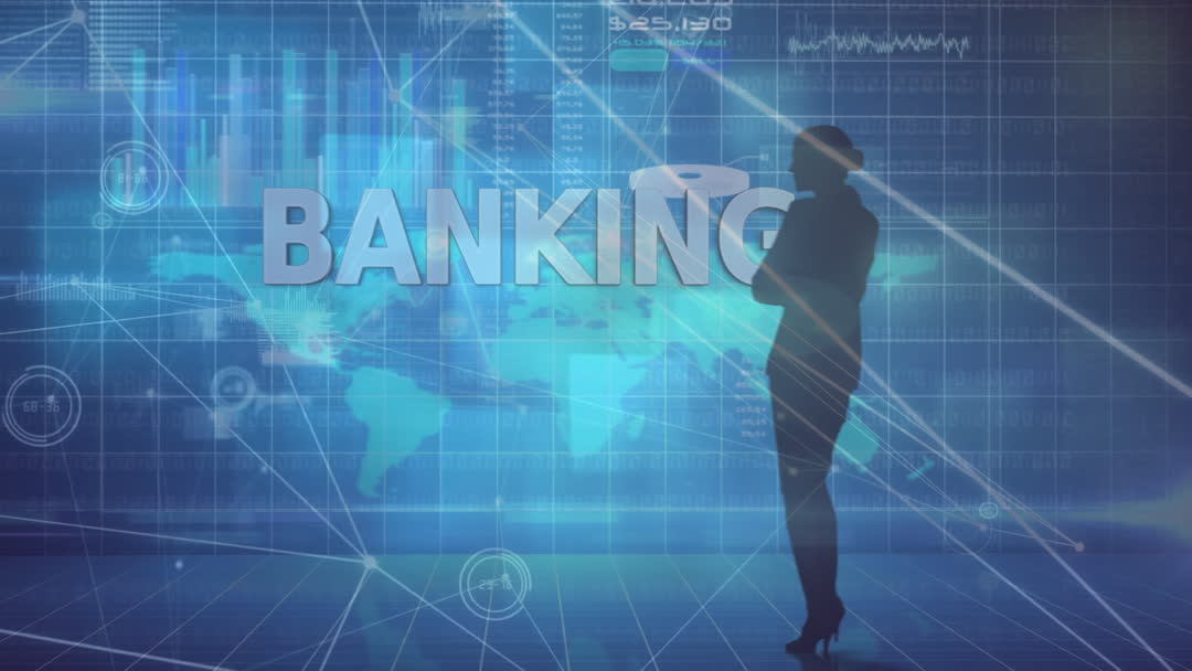 A silhouette of a businesswoman stands against a backdrop featuring digital elements representing banking and blockchain technology. The futuristic setting showcases a world map, graphs, and connected network lines. This composition is ideal for illustrating concepts of finance, data processing, global economy, digital innovation, and technological advancement in marketing materials, presentations, and financial news.