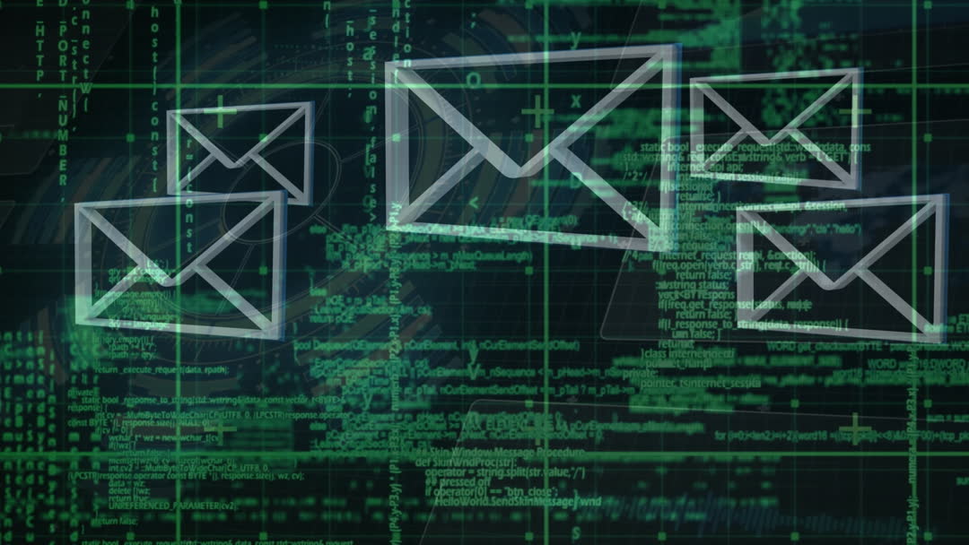 Visualizing the intersection of email and data processing, this video provides valuable context for illustrating concepts in digital communication and cybersecurity. The overlay of coding elements suggests themes related to technology and software, useful for marketing materials or educational content about IT solutions.