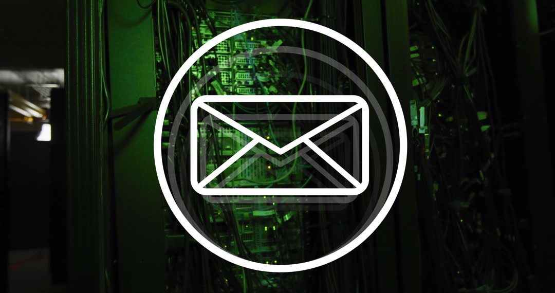 Animation depicting an email icon superimposed over illuminated computer servers in a data center. The scene conveys themes of technological communication, data processing, and cyber security. This visual is useful for illustrating concepts around digital business solutions, email services, and IT infrastructure in various multimedia projects or technology articles.