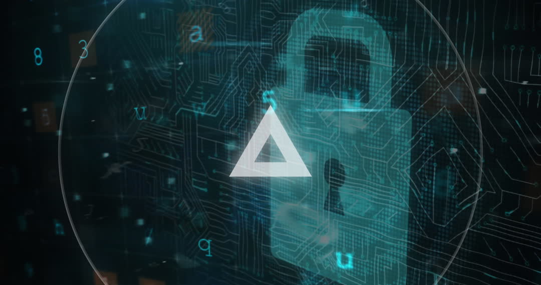 Visual depicts encryption and data security concept with a digital lock and matrix of processing circuitry and numerical data. Triangle shape emphasizes futuristic theme pronounced with a glow. Ideal for using in articles about cybersecurity, online protection solutions, digital technology advancement, virtual security methods, and innovation talks or presentations that focus on technology security.