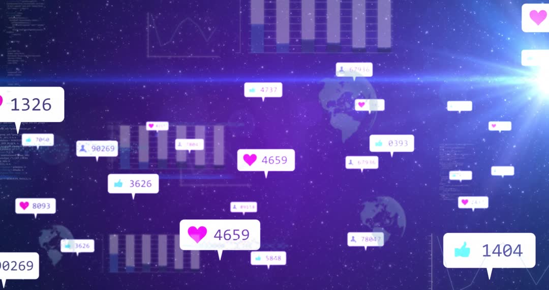 This visualization depicts dynamic metrics showing engagement growth through a futuristic digital design. Numeric values represent likes and interactions, showcased with neon effects. The overlay of engagement bubbles and bar charts brings a technology and data-driven atmosphere. Ideal for use in presentations or projects related to online performance metrics, social media analytics, or tech app interfaces. The futuristic and vibrant aesthetic is suitable for creative industry visuals.