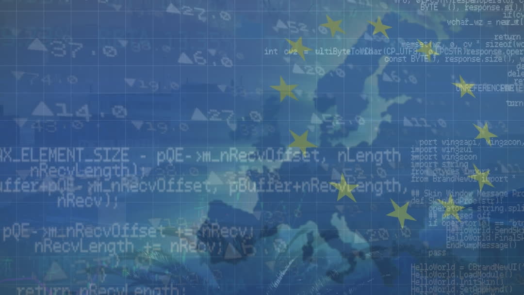 Conceptual illustration featuring the digital landscape and economy of Europe infused with programming code. Visuals suggest themes of technological growth, data protection, and global connectivity within the European Union. Ideal for use in technology, economic discussions, reports on digital transformation, and EU-centric information pieces.