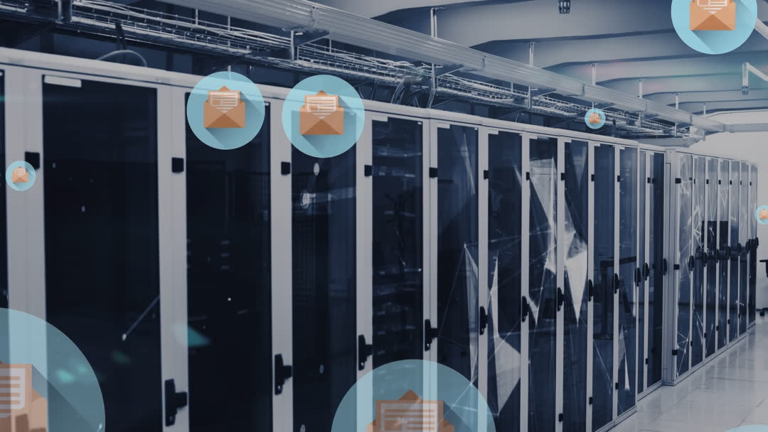 Animation depicting a modern server room with digital file icons floating above the equipment, symbolizing file transfer and data management processes. Suitable for illustrating concepts related to technology, data security, and digital communications, as well as networks and cloud services.