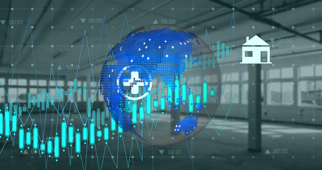 This abstract illustration merges financial graphs and a 3D globe, signifying interconnectedness in global finance and economy. Perfect for presentations on financial technology, economic trends, or global trade, it effectively tackles complex concepts such as stock markets, economic expansion, and the dynamic flow of real estate transactions worldwide. Ideal for use in corporate reports or educational materials focused on economic development and financial systems.