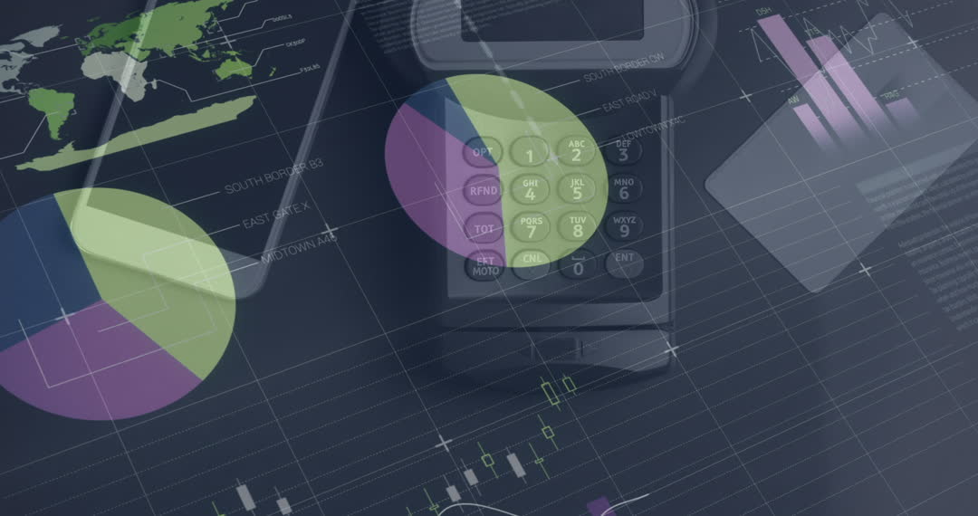 Visual representation combining finance graphs with elements like payment terminal and smartphone, illustrating concepts in modern digital transactions. Ideal for depicting innovations in financial technology, the growth of contactless payment systems, and the tech-driven future of the economy. Useful for articles, presentations, and web content focused on fintech and business innovations.