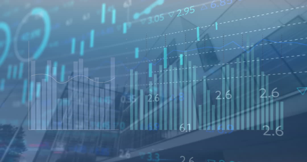 Abstract visualization featuring financial data overlaid with city buildings, highlighting global business and finance technology. Suitable for illustrating topics related to economies, stock markets, and business technology integration.