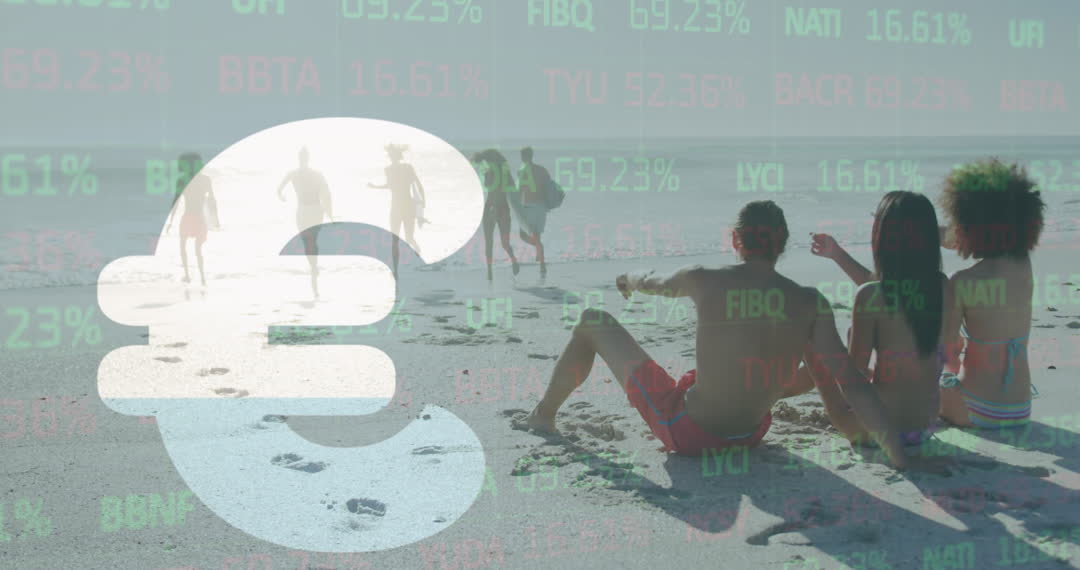 An intriguing combination of financial markets and leisure, illustrating euro symbol and stock market figures superimposed on diverse group of friends enjoying a day at the beach. This visual conveys themes of global finance, travel, and economic trends. Suitable for use in advertisements, blogs, or articles about financial markets, global business, personal finance management, and culture blending finances meant for dynamic and developmental economic positions.