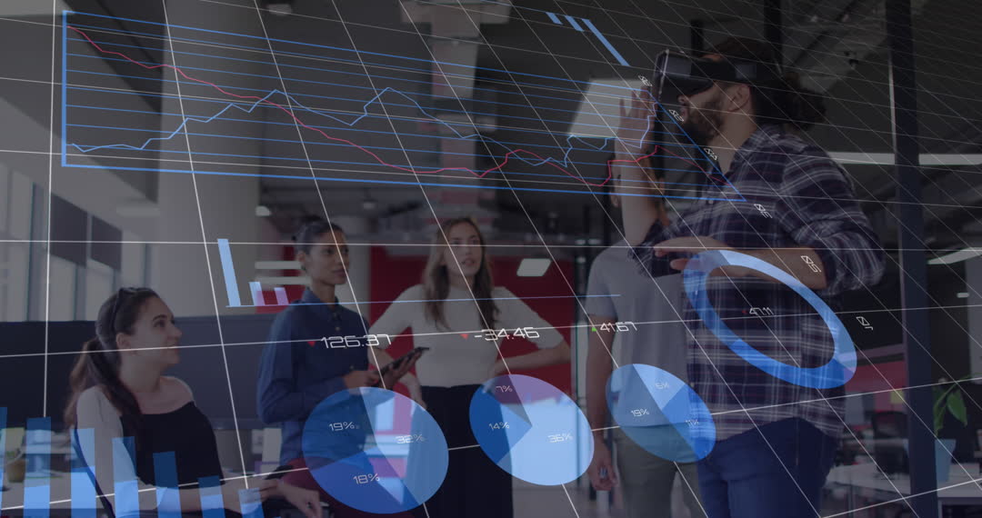 Visual illustrates integration of virtual reality in business setting. Team analyzing financial data using digital systems, representing modern approaches in finance and technology sectors. Useful for presentations on innovation, data analysis trends, and teamwork dynamics.