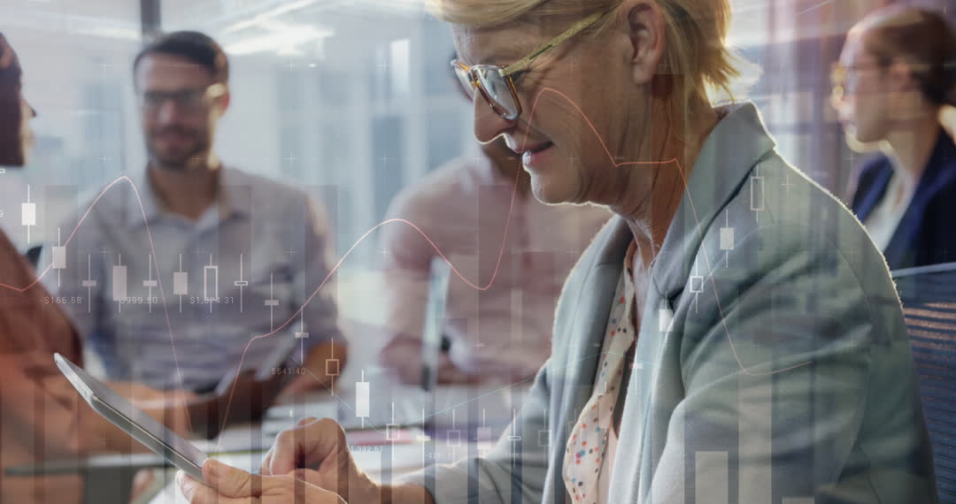 An elder female professional engaging with a digital tablet against a backdrop of animated finanzial data and interacting coworkers at a meeting table suggests a harmonious business setting. This representation is ideal for use in visualizing modern business operations, depicting global finance trends, banking, teamwork, and the integration of technology in everyday business practices.