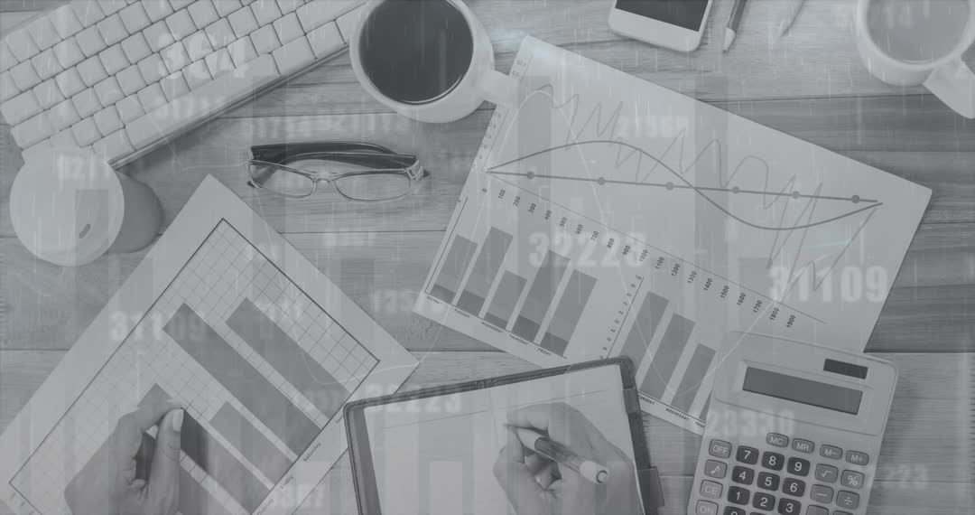 Captures dynamic visualization of financial analysis and global data insights on a business workspace. Useful for illustrating concepts related to analytics, global finance, and technological impacts in presentations, reports, or digital marketing content focusing on business and economic trends.