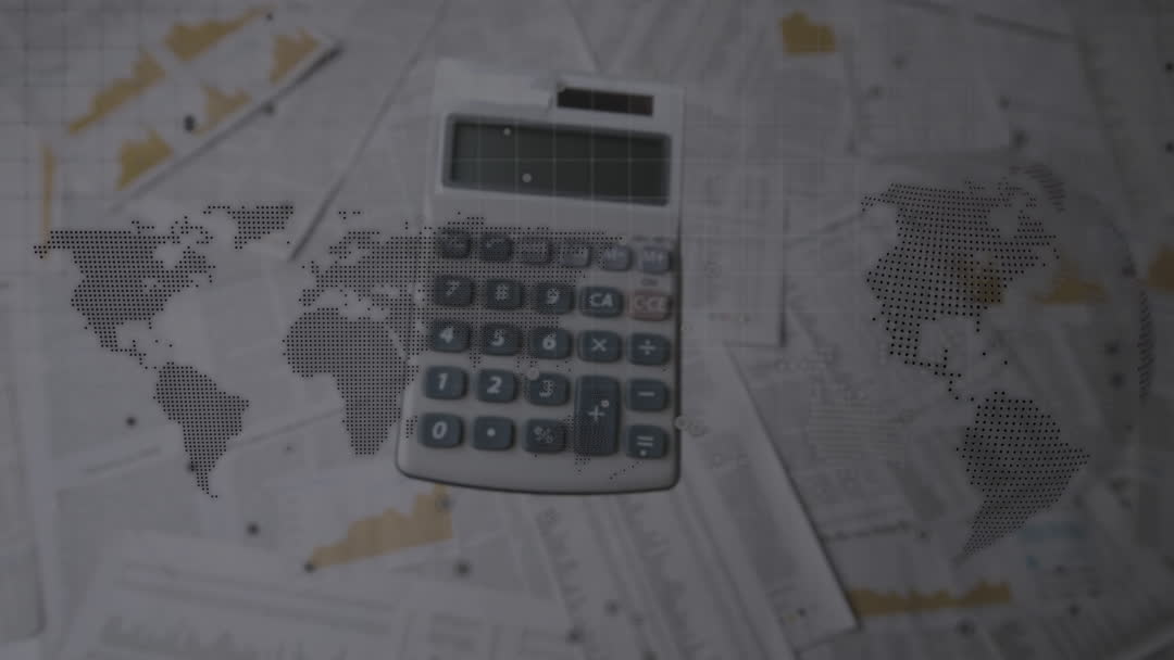 Calculator overlaying financial documents with charts suggests global business and financial analysis. Ideal for content on digital analytics, data management, and international economic forecasting.